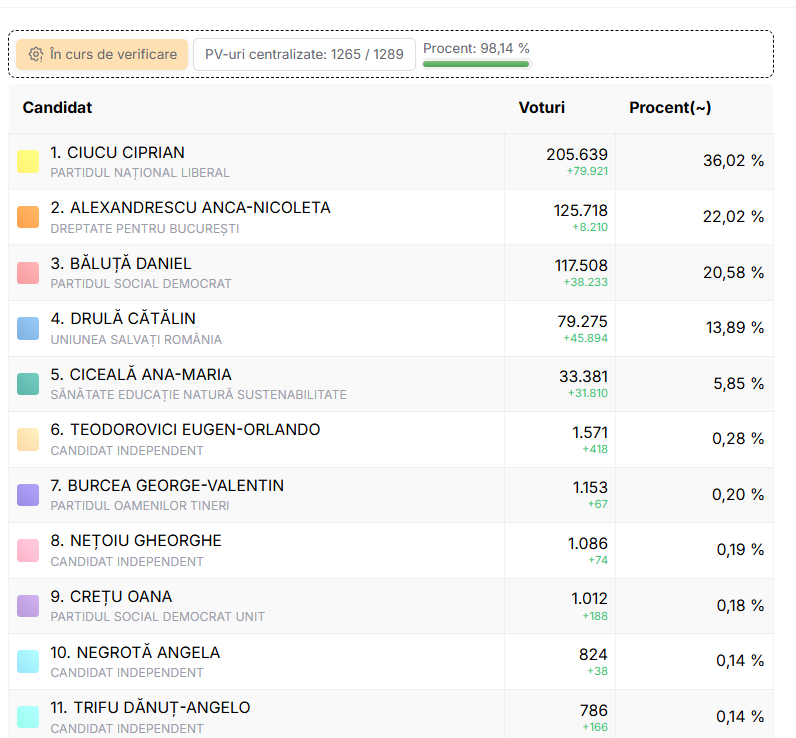 Rezultatele alegerilor pentru Primăria Generală a Capitalei arată că noul edil este Ciprian Ciucu, candidatul PNL. Mai sunt de numărat aproximativ 25.000 de voturi la momentul redactării știrii.