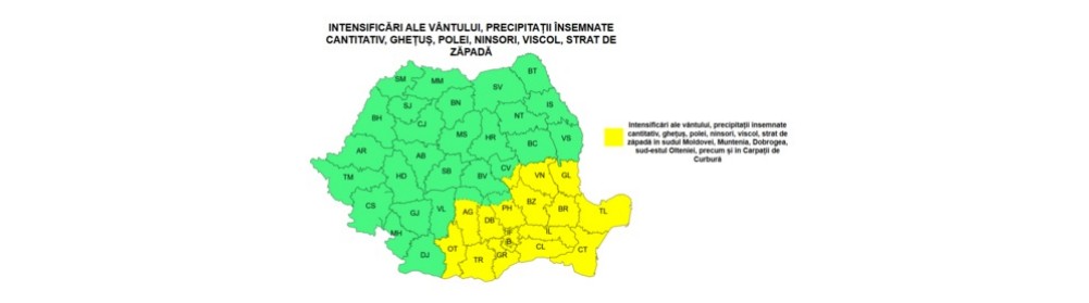 Noutatea ANM față de informarea meteorologică emisă joi este alerta Cod galben, care anunță viscol puternic și precipitații însemnate cantitativ peste zonele deja afectate de vânt și ninsori.