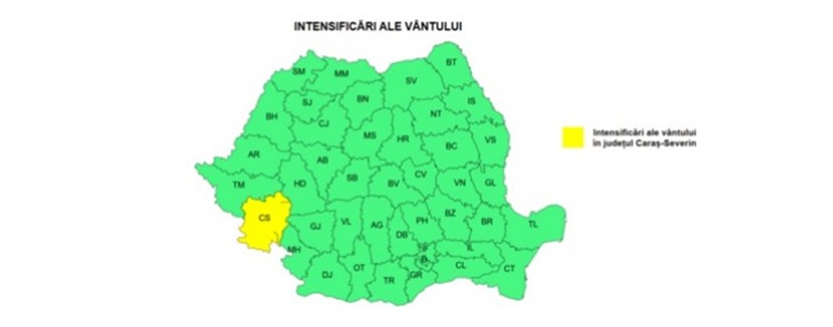 Codul galben de vânt este în vigoare pentru județul Caraș-Severin începând de vineri seară. ANM anunță intensificări cu viteze de 50-60 km/h, iar izolat rafalele pot atinge 65-70 km/h.