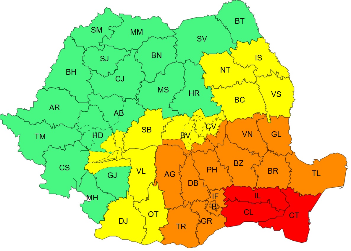 Potrivit avertizării Cod roșu, în județele Constanța, Călărași și Ialomița va ploua abundent, iar în intervale scurte de timp sau prin acumulare vor fi cantități de apă de 110…120 l/mp. Aceasta este în vigoare de marți de la ora ora 21.00 până miercuri la ora ora 23.00.
