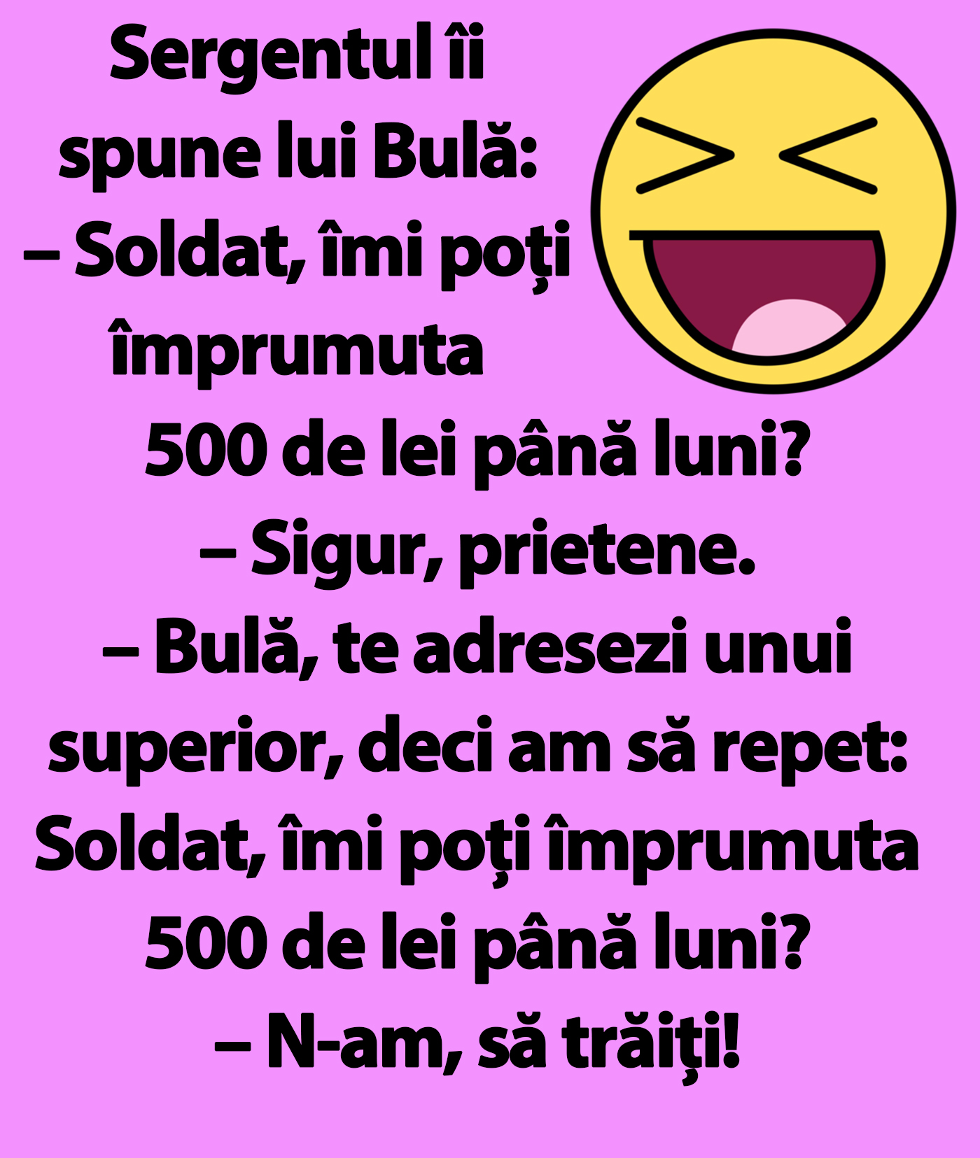 – Bulă, te adresezi unui superior, deci am să repet: Soldat, îmi poți împrumuta 500 de lei până luni?