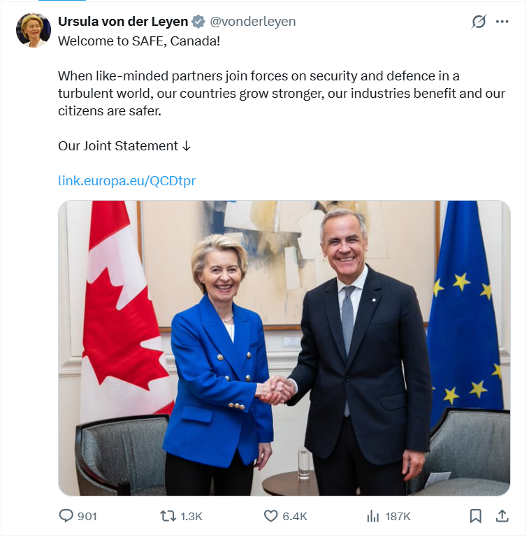 Canada a devenit oficial prima țară non-UEcare a aderat la programul de finanțare a apărării al Uniunii Europene, SAFE, instrumentul de investiții în apărare în valoare de 150 de miliarde de euro. Anunțul a fost făcut pe 1 decembrie de către premierul canadian Mark Carney și liderii Uniunii Europene. Acordul este văzut ca un pas important în consolidarea Parteneriatului de Securitate și Apărare UE-Canada, semnat în iunie 2025.