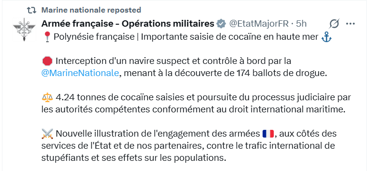 Întreaga încărcătură de cocaină a fost distrusă pe mare, departe de zona economică polineziană și de zona maritimă protejată, au declarat oficialii pentru AFP. Parchetul nu a formulat acuzații pentru a nu împovăra instanța locală cu un caz de trafic de droguri care nu era destinat Polineziei Franceze, iar nava și echipajul său au fost eliberați conform dreptului internațional. Luna trecută, marina franceză a mai capturat 5 tone metrice de cocaină de pe o navă de pescuit din apropierea Polineziei Franceze, ...