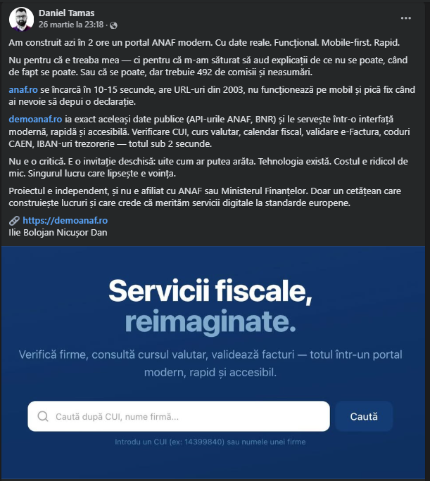 Un IT-ist din Cluj-Napoca a demonstrat că este mai priceput decât autoritățile române, după ce a construit, în numai două ore, o versiune alternativă a platformei ANAF demoanaf.ro. Acesta a fost, ulterior, contactat de vicepremier, ministrul Economiei și conducerea Fiscului, iar portalul construit de acesta a generat discuții aprinse.