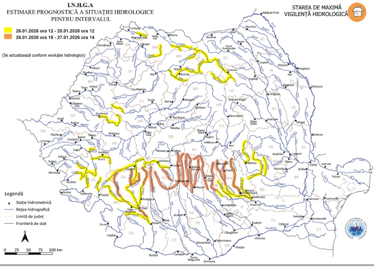 Hidrologii anunță scurgeri importante pe versanţi, torenţi şi pâraie, viituri rapide pe râurile mici cu posibile efecte de inundaţii locale şi creşteri de debite şi niveluri pe unele râuri din bazinele hidrografice menţionate, cu posibile depăşiri ale cotelor de apărare.