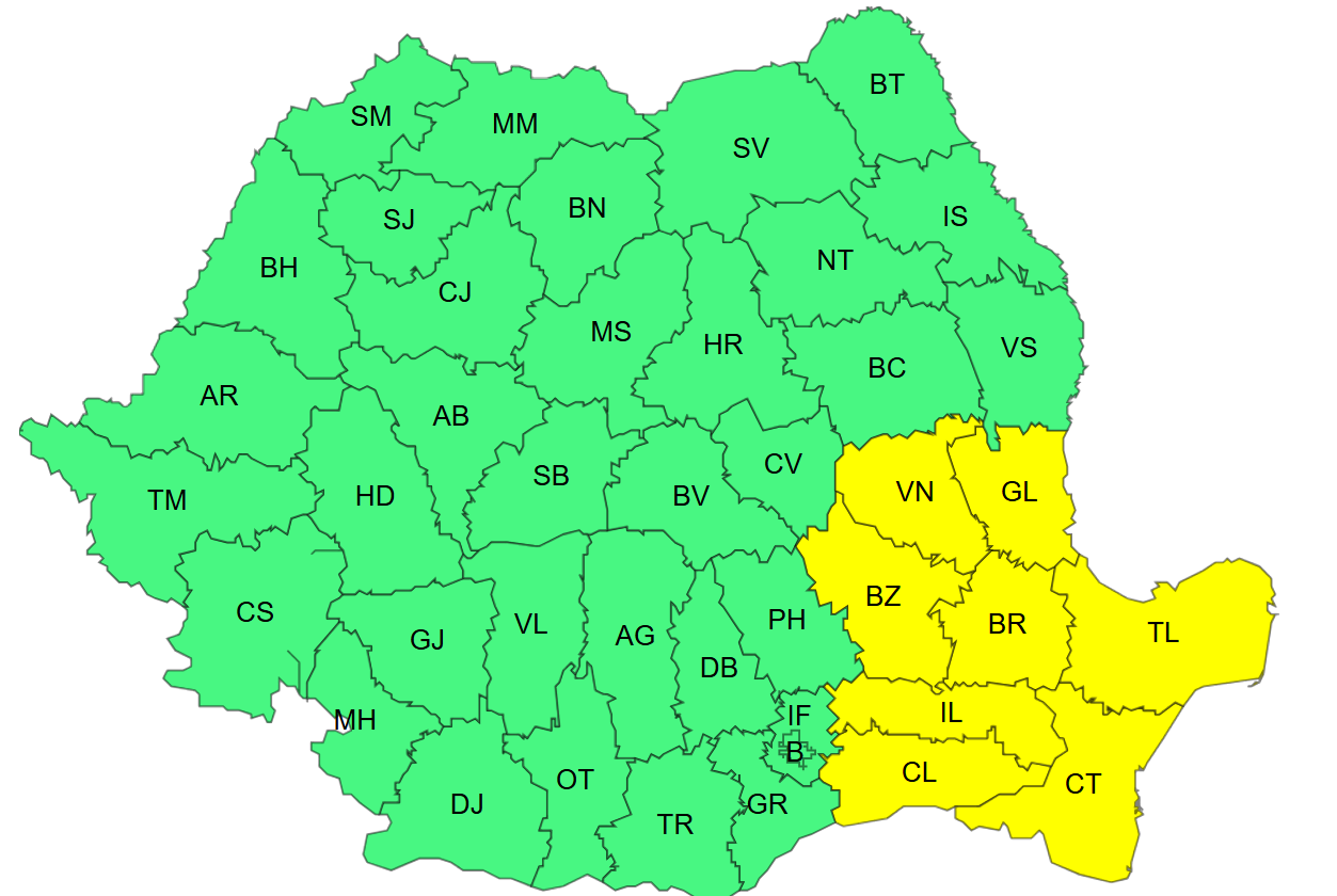 De asemenea, până la ora 18:00, este valabil și cod galben, emis tot pentru intensificări ale vântului.