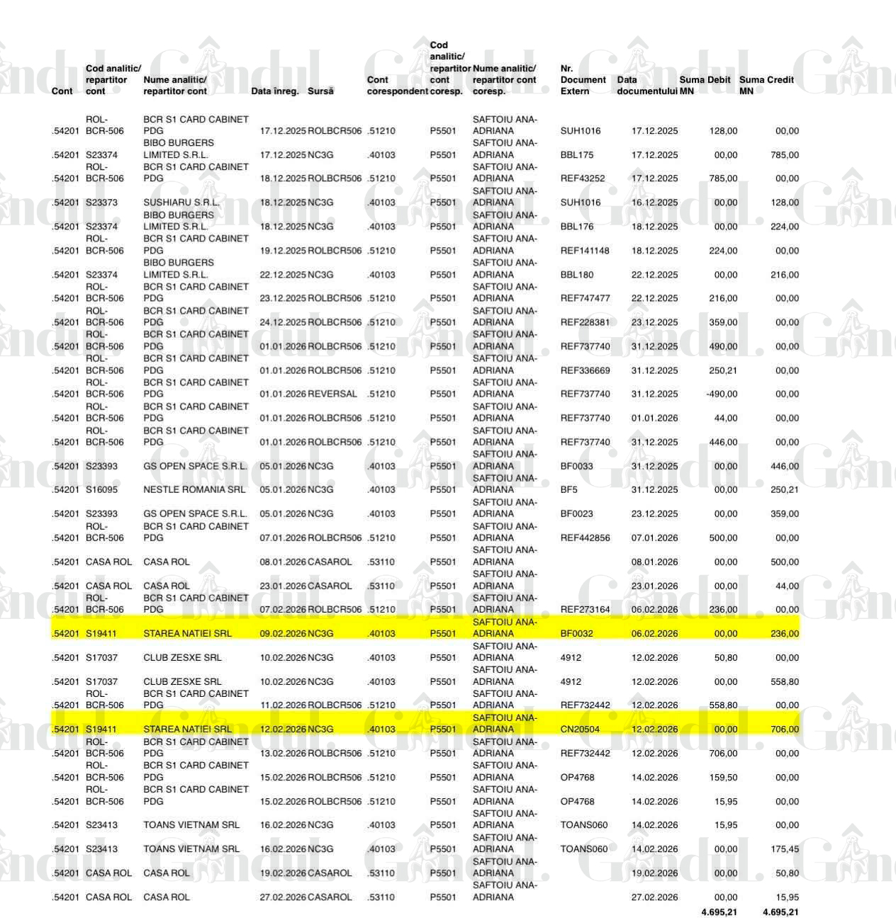 Potrivit reglementărilor interne, Președintele Director General are acces la un card de protocol pe care îl poate folosi în situații – așa cum spune numele – de protocol. În context oficial, întâlniri, reprezentări ale instituției etc. Din informațiile intrate în posesia Gândul, se pare ca Adriana Săftoiu face cumpărături cu cardul companiei și în nume personal. Achizițiile care ne-au atras atenția, potrivit datelor contabile, au fost făcute de Saftoiu inclusiv de pe platforma lui Dragoș Pătraru.