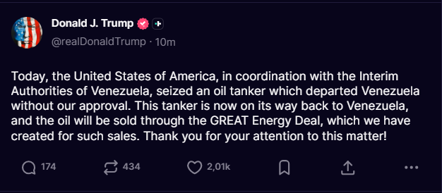 „Astăzi, Statele Unite ale Americii, în coordonare cu autoritățile interimare din Venezuela, au confiscat un petrolier care a plecat din Venezuela fără aprobarea noastră. Acest petrolier se află acum în drum spre Venezuela, iar petrolul va fi vândut prin intermediul GREAT Energy Deal, pe care l-am creat pentru astfel de vânzări. Vă mulțumim pentru atenția acordată acestei chestiuni!”, a transmis președintele SUA pe TruthSocial.