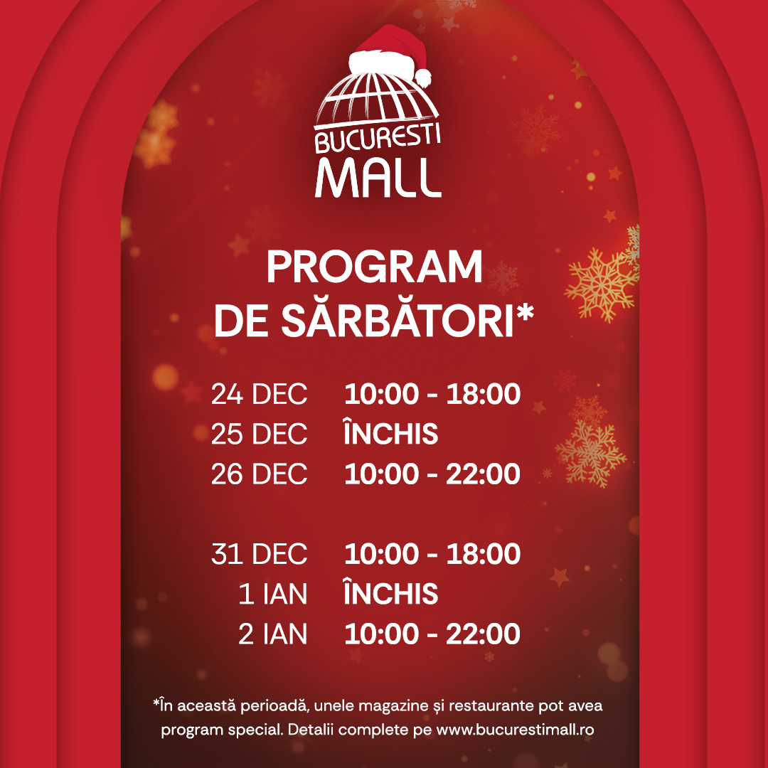 În cele două centre comerciale, vizitatorii vor găsi decoruri festive, oferte sezoniere și o gamă variată de produse pentru cadouri, decorațiuni și ținute de sărbători. Programul anunțat este: