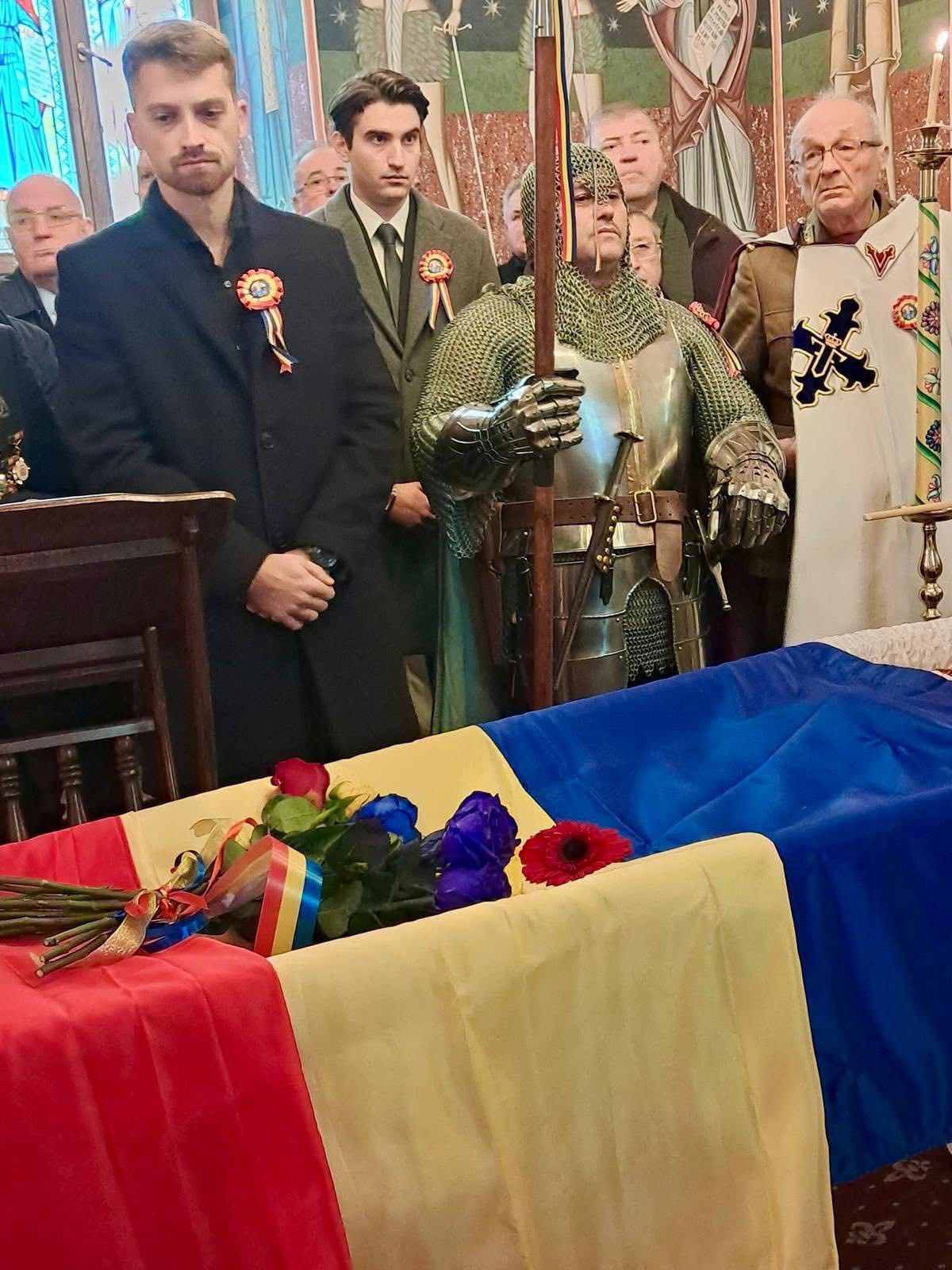 Un bărbat îmbrăcat într-o armură de inspirație medievală a stat de pază lângă sicriu pe parcursul ceremoniei. Imaginea a ieșit din tiparul unei înmormântări obișnuite și a fost interpretată ca un gest simbolic, legat de ideea de luptă, onoare și apărare a valorilor naționale.