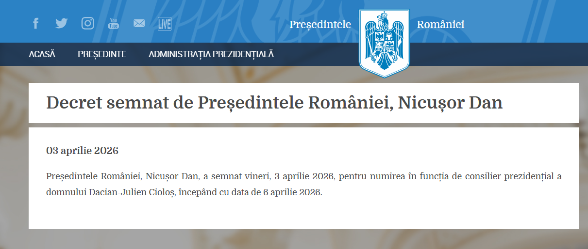 „Președintele României, Nicușor Dan, a semnat vineri, 3 aprilie 2026, pentru numirea în funcția de consilier prezidențial a domnului Dacian Julien Cioloș”, transmite Administrația Prezidențială, care precizează că acesta își va asuma rolul de luni, 6 aprilie.