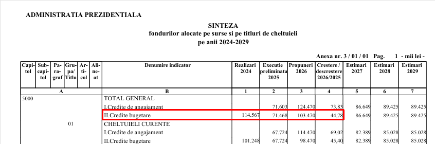 În 2025, Administrația Prezidențială a primit un buget de 71,468 milioane de lei, iar acum, datele publicate de Ministerul Finanțelor arată că Nicușor Dan va primi cu 44,78 milioane de lei în plus. Astfel, deși se laduă că economisește bani la buget cu fiecare ocazie care se invește, președintele României va primi în 2026 de la guvernul Bolojan un buget mai mult decât generos, de 103,470 de milioane de lei.