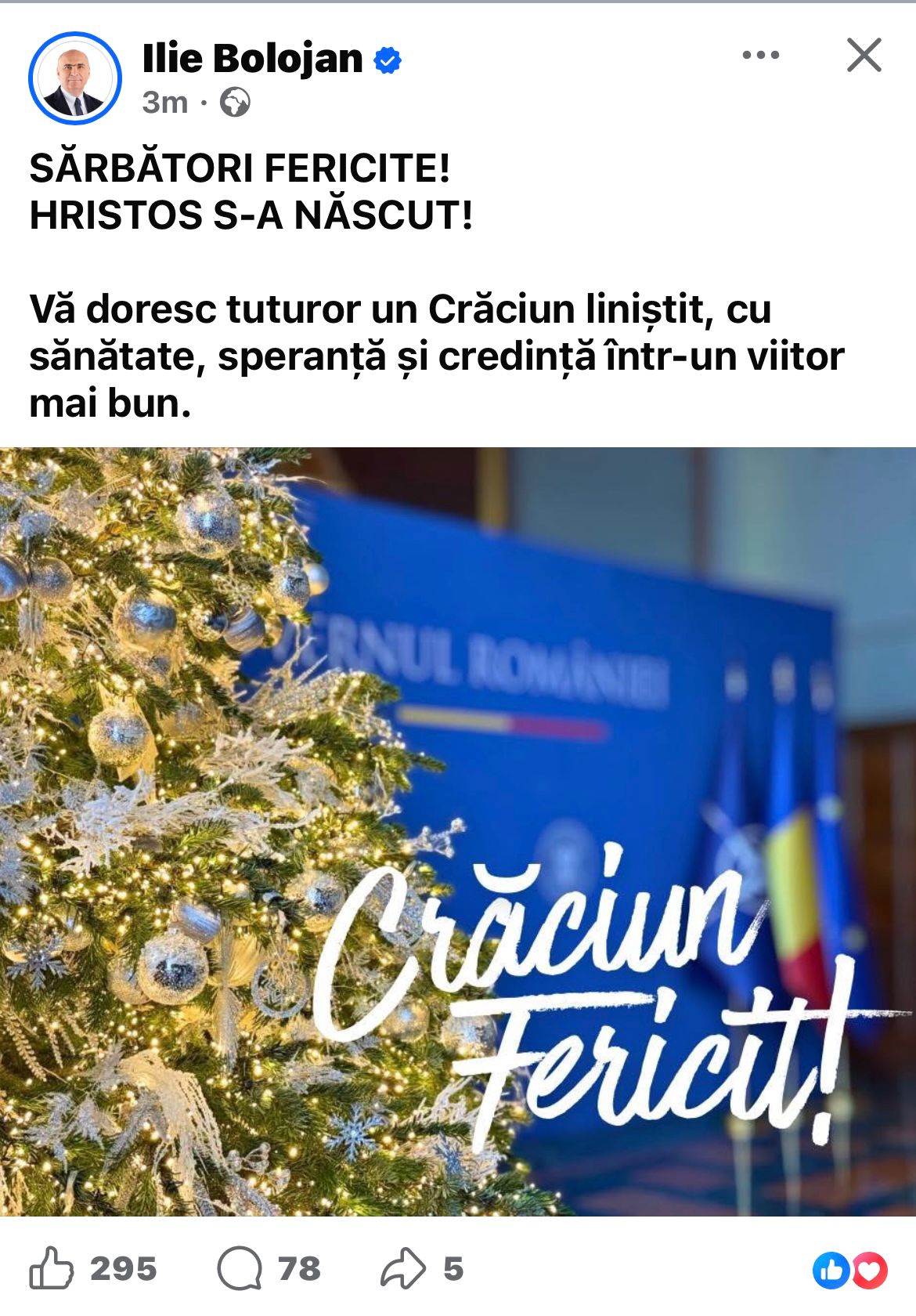 Premierul Ilie Bolojan a transmis un mesaj în Ajunul Crăciunului, în care le-a urat românilor sărbători fericite, cu sănătate, speranță și credință într-un viitor mai bun.