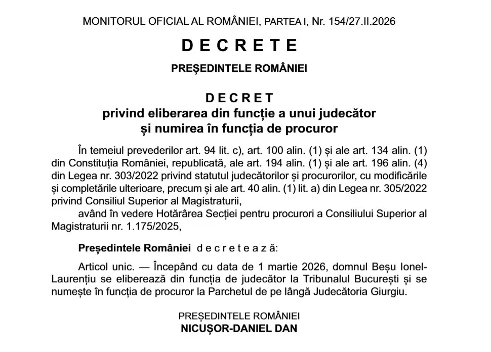 Președintele Nicușor Dan a semnat decretul prin care Ionel Laurențiu Beșu își schimbă oficial rolul în justiție: acesta pleacă de la Tribunalul București, unde a fost judecător, pentru a deveni procuror la Giurgiu.