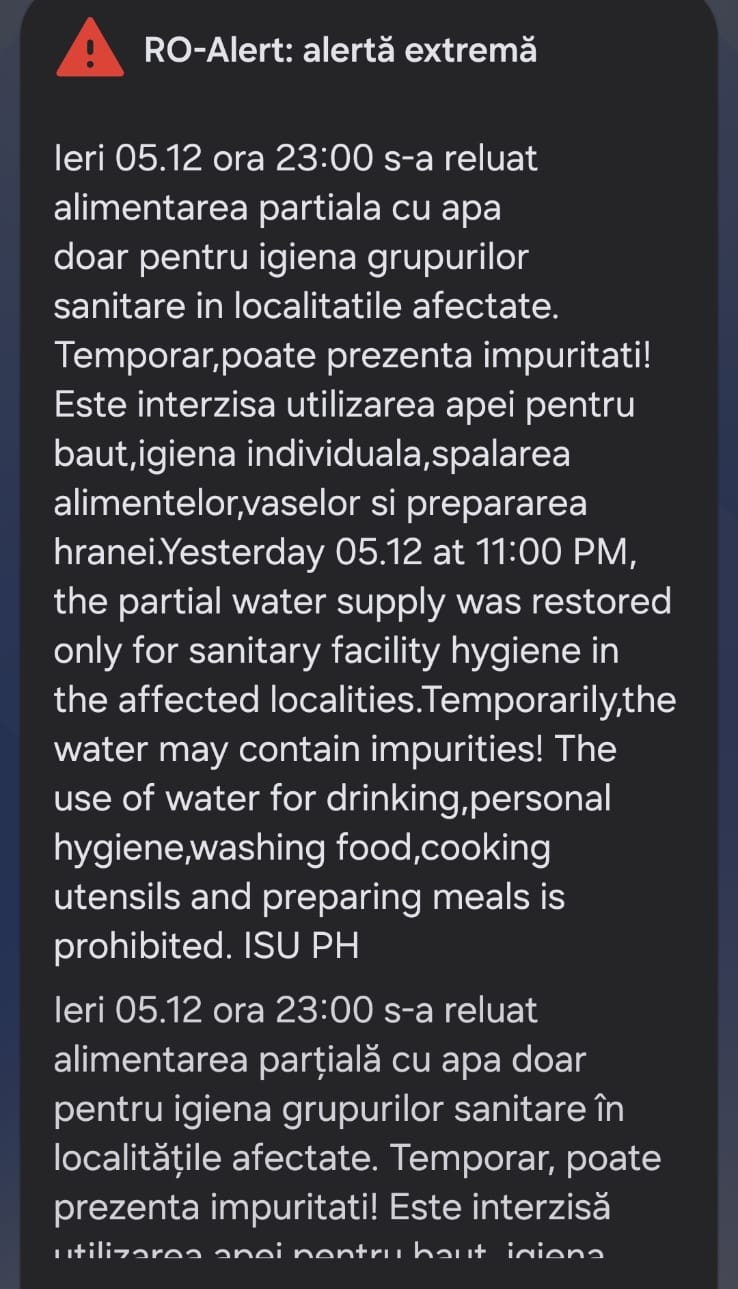 Într-un mesaj RO Alert transmis sâmbătă dimineaţă, autorităţile din Prahova anunţă că a fost reluată alimentarea cu apă, însă aceasta nu este potabilă.