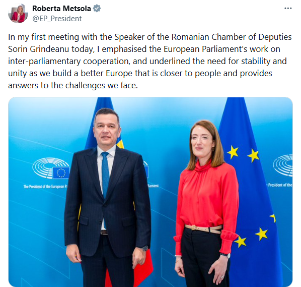 „În cadrul primei mele întâlniri de astăzi cu președintele Camerei Deputaților din România, Sorin Grindeanu, am evidențiat activitatea Parlamentului European în domeniul cooperării interparlamentare și am subliniat necesitatea stabilității și a unității în eforturile noastre de a construi o Europă mai bună, mai aproape de cetățeni și capabilă să ofere răspunsuri la provocările cu care ne confruntăm”, a scris Roberta Metsola pe X.