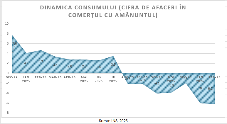 Datele publicate de Institutul Național de Statistică (INS) privind cifra de afaceri din comerțul cu amănuntul arată o imagine de coșmar pentru mediul de afaceri și pentru bugetul de stat. Potrivit graficului, economia a intrat într-o zonă de contracție profundă. Asistăm la 7 luni consecutive (august 2025 – februarie 2026) în care dinamica consumului este pe minus. Dacă în decembrie 2024 consumul înregistra un avans de 7,8%, curba a coborât dramatic, ajungând la un minim alarmant de -6,2% în februarie 2026.