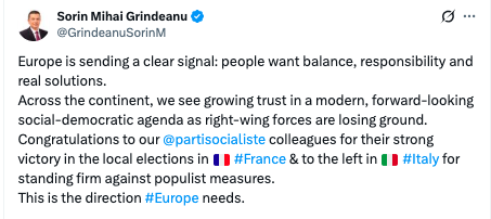 Sorin Grindeanu felicită socialiștii din Franța și Italia pentru alegerile locale: „Aceasta este direcția de care Europa are nevoie”