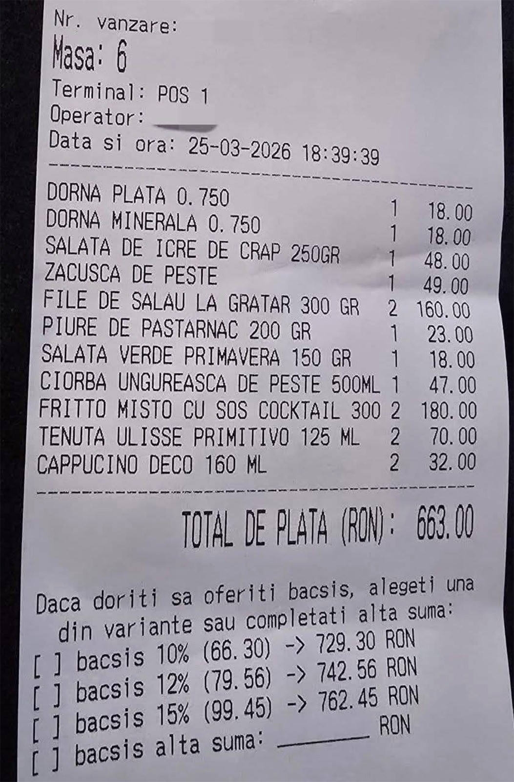 Carmen a mers la un restaurant din țară, iar nota de plată pentru ce a consumat s-a ridicat la 663 de lei. Bonul fiscal arată prețuri care, pentru mulți români, nu mai sunt neobișnuite. Totuși, pentru cei obișnuiți cu veniturile din Elveția, par surprinzătoare în raport cu așteptările privind România.
