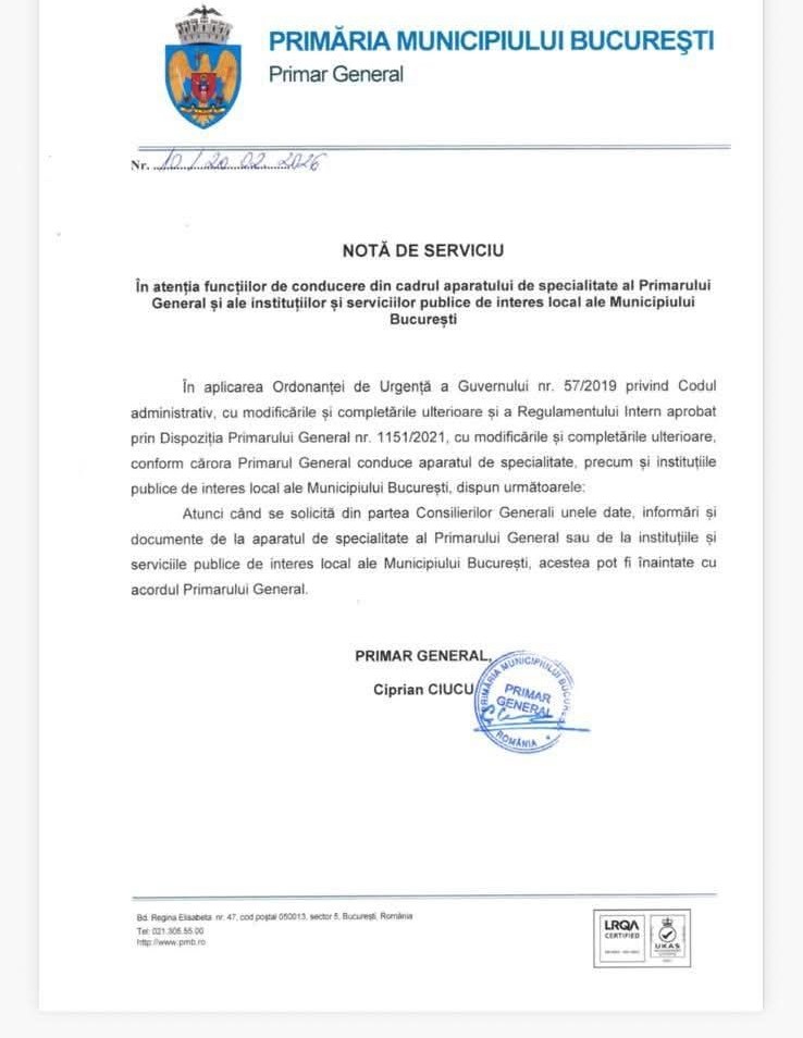 Potrivit unei circulare transmite de primarul Ciprian Ciucu, consilierii pot obţine informaţii despre activitatea primăriei sau a instituţiilor subordonate numai cu acordul edilului general. Lucru care i-a înfuriat teribil pe consilierii de la diverse partide. Nici fostul primar al Sectorului 5, Cristian Popescu Piedone, nu a putut să rămână indiferent, având în vedere că reprezentanţii PUSL din Consiliul General al PMB se află încă sub influenţa acestuia.