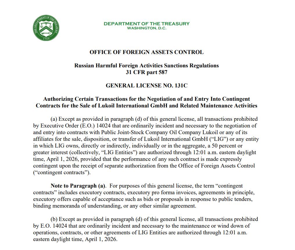 Prelungirea anunțată astăzi de Departamentul Trezoreriei SUA este a patra extindere a termenului-limită stabilit de autoritățile americane pentru vânzarea activelor internaționale ale grupului Lukoil. Potrivit anunțului făcut de Oficiul pentru Controlul Activelor Străine (OFAC), noul termen a fost fixat pentru data de 1 aprilie, fiind extins de la scadența anterioară, 28 februarie.
