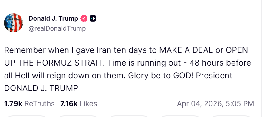„Vă amintiți când i-am dat Iranului zece zile să ÎNCHEIE UN ACORD sau să REDESCHIDĂ STRÂMTOAREA ORMUZ. Timpul se scurge – mai sunt 48 de ore până când iadul se va dezlănțui asupra lor”, a scris liderul de la Casa Albă pe Truth Social.