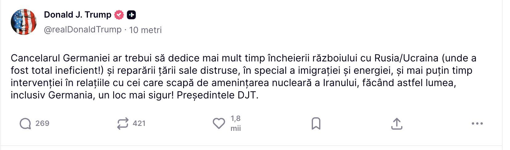 „Cancelarul Germaniei ar trebui să dedice mai mult timp încheierii războiului cu Rusia/Ucraina (unde a fost total ineficient!) și reparării țării sale distruse, în special a imigrației și energiei, și mai puțin timp intervenției în relațiile cu cei care scapă de amenințarea nucleară a Iranului, făcând astfel lumea, inclusiv Germania, un loc mai sigur!