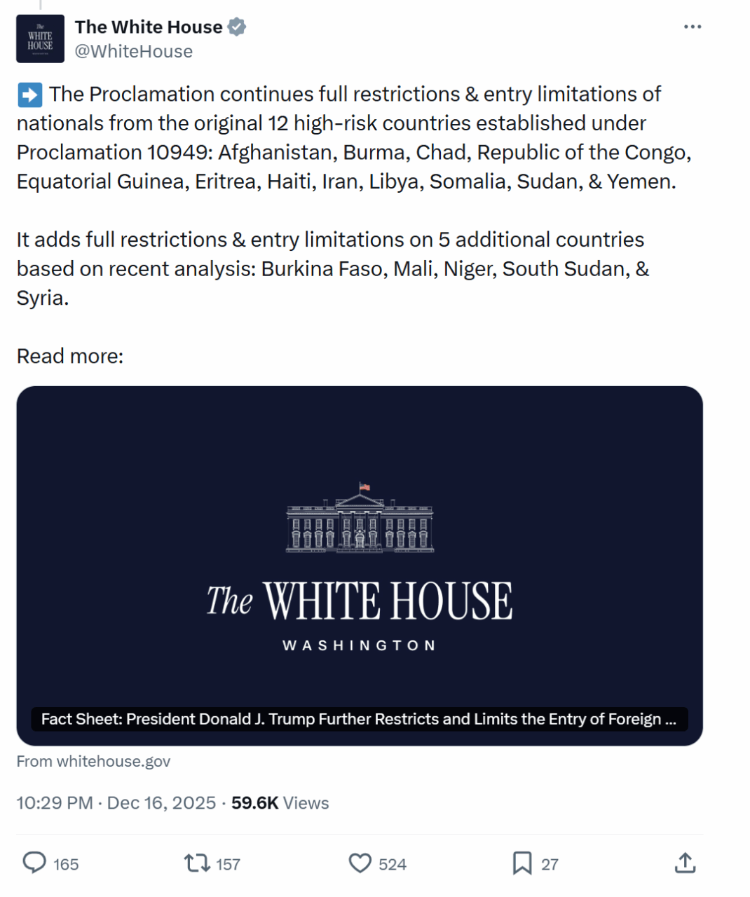 Proclamația restrânge și limitează intrarea cetățenilor străini din țările vizate pentru a proteja securitatea Statelor Unite”, a anunțat Casa Albă pe platforma X.