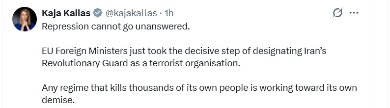 Uniunea Europeană a desemnat oficial Corpul Gărzilor Revoluționare Islamice din Iran drept organizație teroristă, a anunțat șefa politicii externe a UE, Kaja Kallas. Această decizie marchează o schimbare istorică în politica externă a blocului comunitar față de Teheran. Această mișcare aliniază UE cu pozițiile deja adoptate de Statele Unite, Canada și Suedia, care au clasificat anterior IRGC drept entitate teroristă.