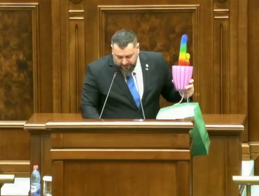 Moment comic, luni după-amiază, la Parlament. Senatorul AUR Ștefan Geamănu a venit cu un cactus în culorile curcubeului și l-a dedicat celor de la USR.