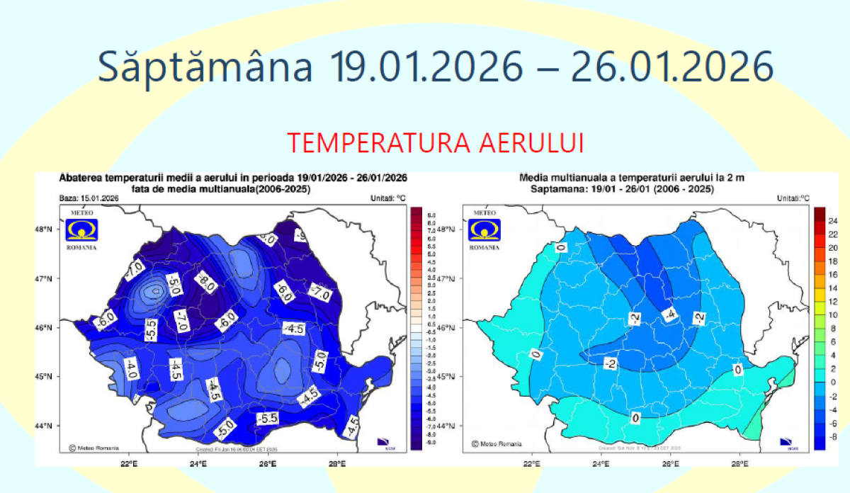 Valorile termice vor fi mai coborâte decât cele specifice acestei săptămâni în toate regiunile țării, cu o abatere termică negativă mai accentuată în jumătatea nordică a teritoriului.