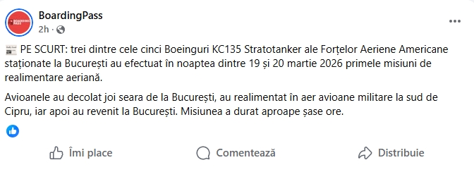 Trei dintre cele cinci aeronave Boeing KC-135 Stratotanker staționate în București au efectuat, în noaptea de 19 spre 20 martie, primele operațiuni de realimentare aeriană, în cadrul unei misiuni desfășurate la sud de Cipru, potrvit Boarding Pass.