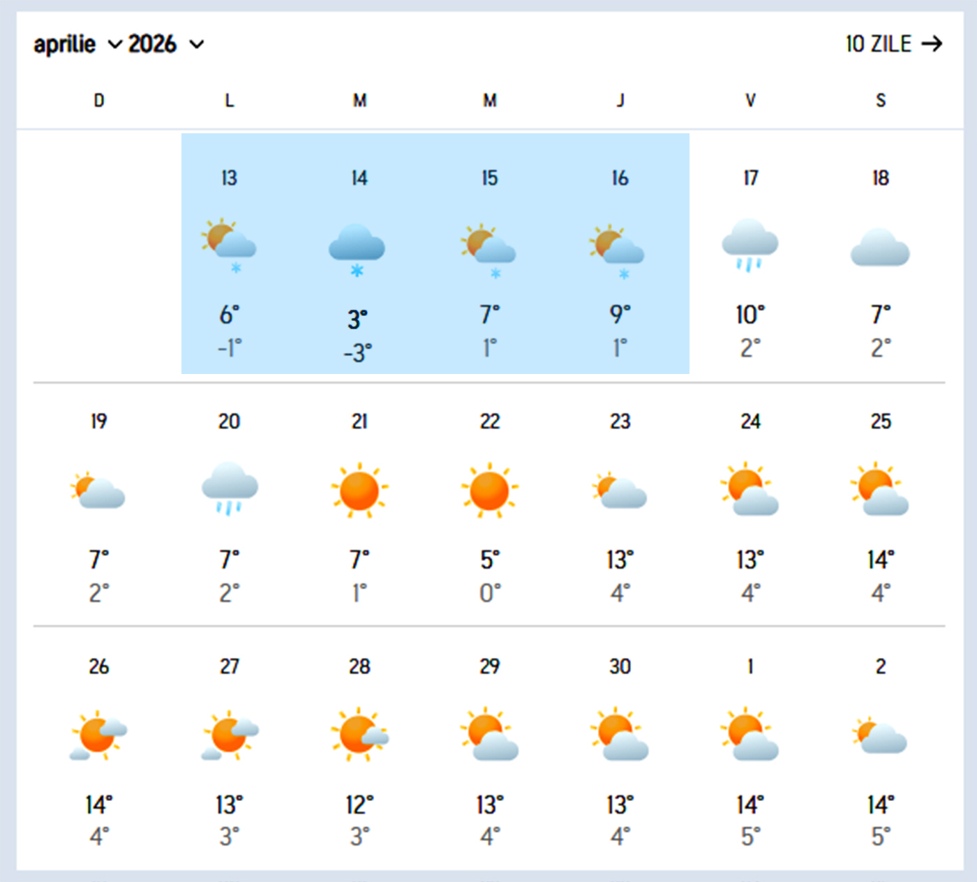 Prognoza după Paște indică patru zile de ninsori, dar și temperaturi mai scăzute față de normalul perioadei din calendar.