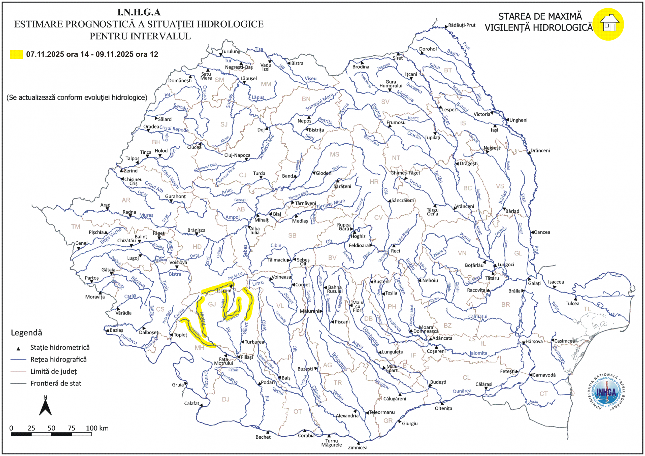 Avertizarea este valabilă în intervalul 7 noiembrie, ora 14:00 – 9 noiembrie, ora 12:00 și vizează județele Hunedoara, Mehedinți și Gorj.