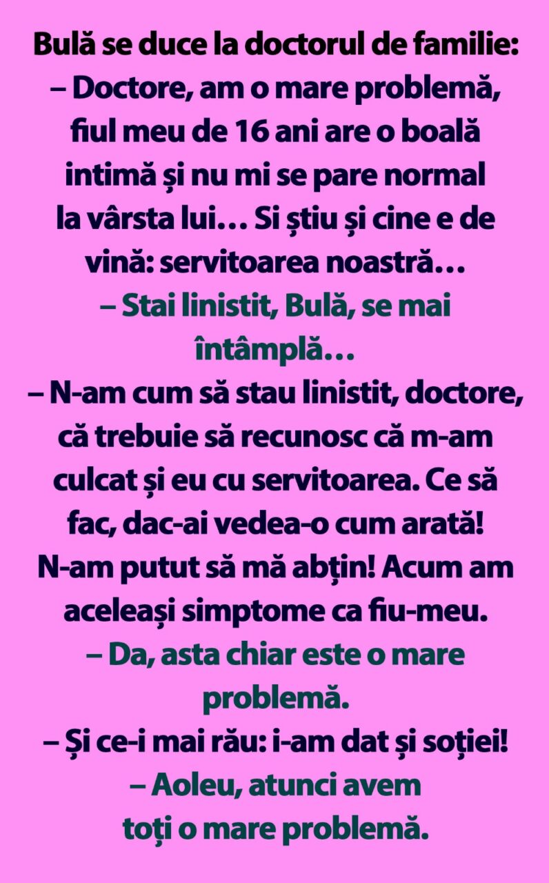 Sursa: https://www.gandul.ro/bancuri/banc-bula-si-doctorul-de-familie-20623743