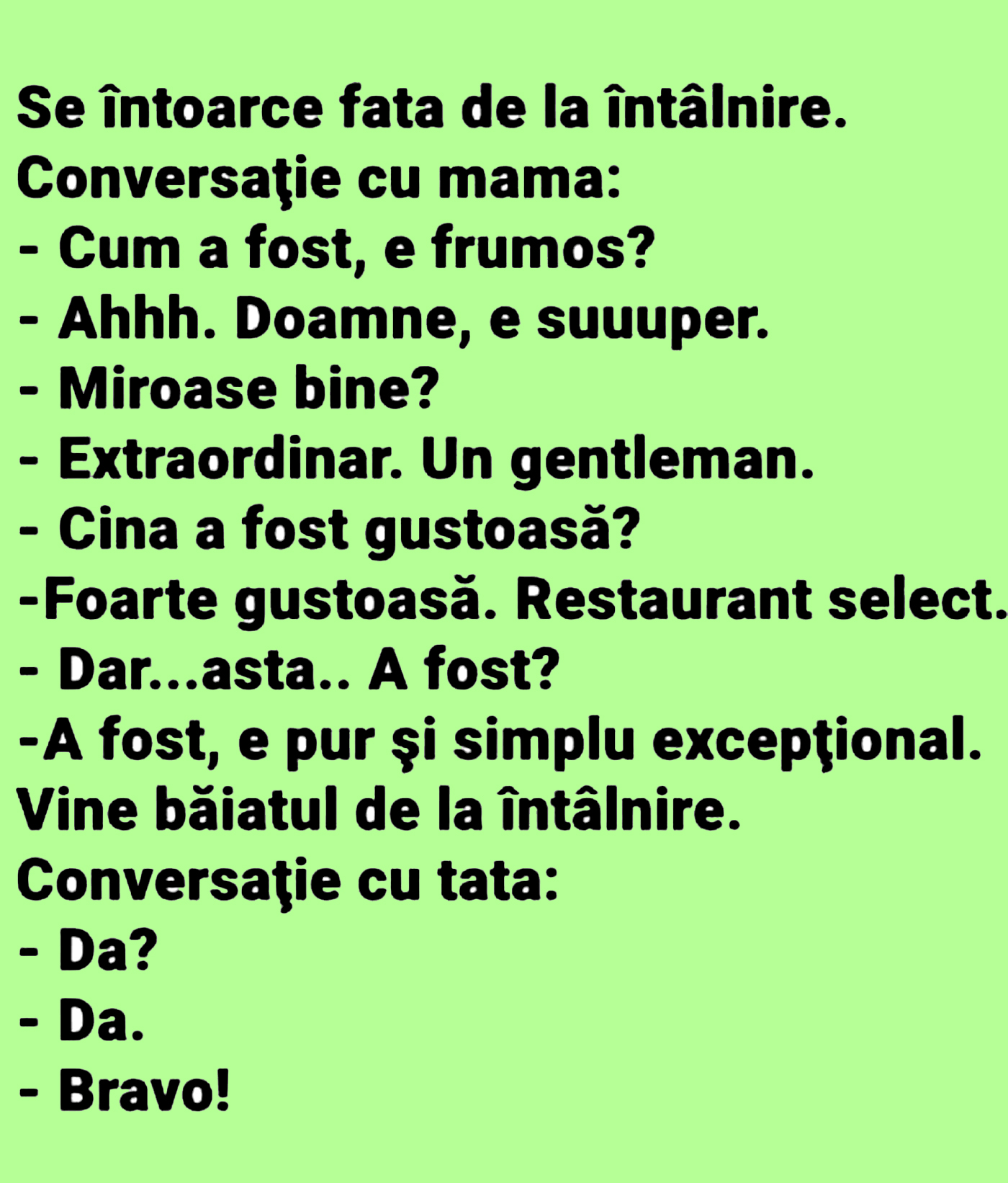 Sursa: https://www.gandul.ro/bancuri/bancul-zilei-conversatie-cu-parintii-dupa-prima-intalnire-20622972