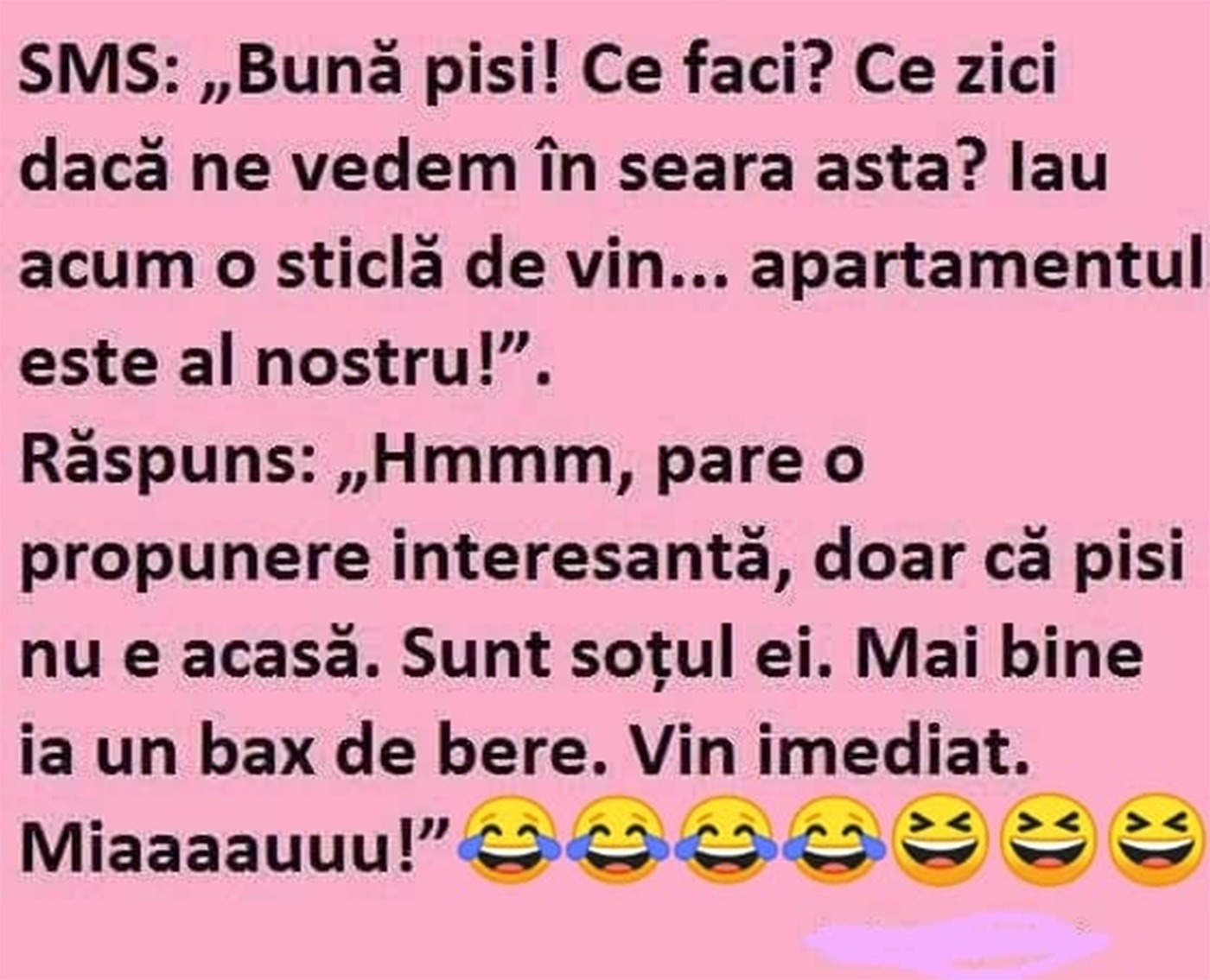 Sursa: https://www.gandul.ro/bancuri/bancul-zilei-sms-buna-pisi-ce-zici-ne-vedem-in-seara-asta-20620745