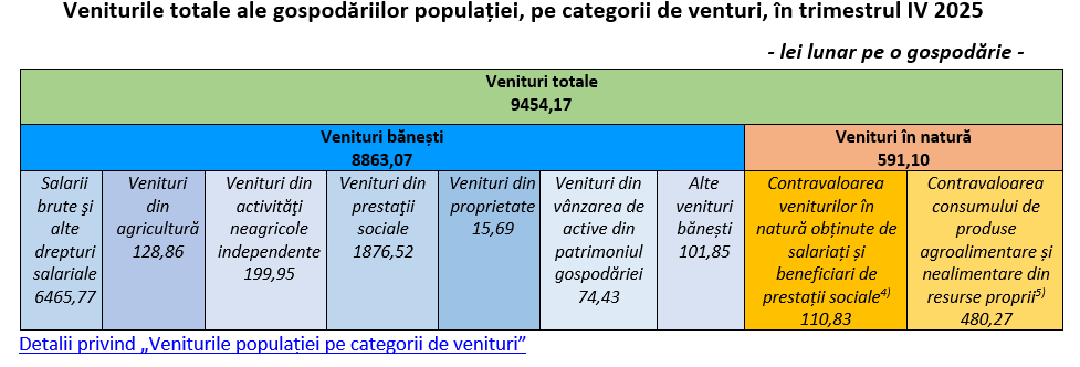Conform datelor publicate de INS, în trimestrul IV al anului 2025, veniturile bănești medii lunare au fost de 8.863 lei lunar pe o gospodărie, ceea ce înseamnă 3.566 lei pe o persoană, în scădere cu 0,2% față de trimestrul anterior. Salariile brute și alte drepturi salariale au fost de 6.466 lei lunar pe o gospodărie și au format 68,4% din veniturile totale ale gospodăriilor.