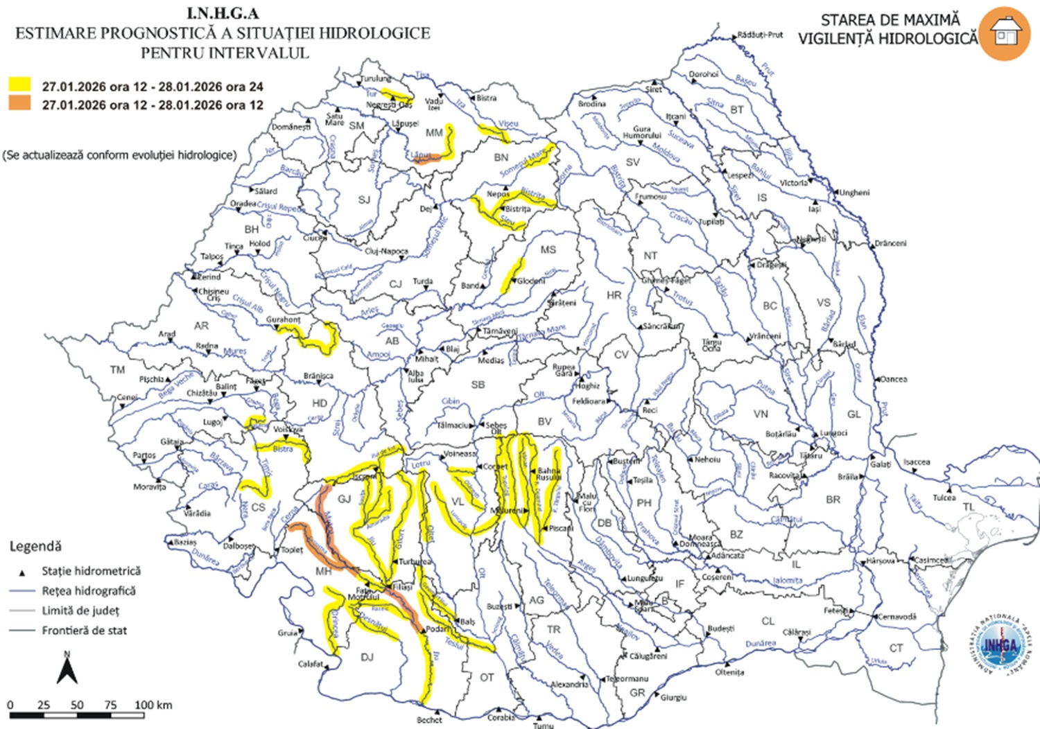 În intervalul 27 ianuarie, ora 12:00 – 28 ianuarie, ora 24:00 (miercuri noapte), va fi Cod galben pe râurile din bazinele hidrografice Iza, Tur, Lăpuș, Someșul Mare, Crișul Alb, Mureș, Timiș, Drincea, Desnățui, Jiu, Olt, Olteț, Teslui și Argeș.