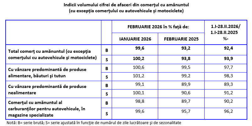 Volumul cifrei de afaceri din comerțul cu amănuntul a scăzut puternic în februarie 2026 comparativ cu aceeași lună din 2025, cu 6,8% ca serie brută și 6,2% ajustat sezonier, arată datele publicate de Institutul Național de Statistică (INS).