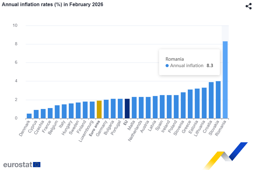 Rata anuală a inflației în Uniunea Europeană a fost de 2,1% în februarie 2026, în creștere față de 2,0% în ianuarie, arată datele publicate de Eurostat. România continuă să fie țara cu cea mai ridicată inflație, cu un avans anual al prețurilor de 8,3%, arată aceleași date publicate de Oficiul de statistică al Uniunii Europene.