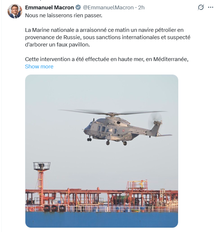 „În această dimineață, Marina Franceză a abordat un petrolier provenind din Rusia, supus unor sancțiuni internaționale și suspectat că arborează un pavilion fals. Operațiunea a fost desfășurată în marea liberă din Mediterana, cu sprijinul mai multor aliați ai noștri. A fost efectuată în strictă conformitate cu Convenția Națiunilor Unite...