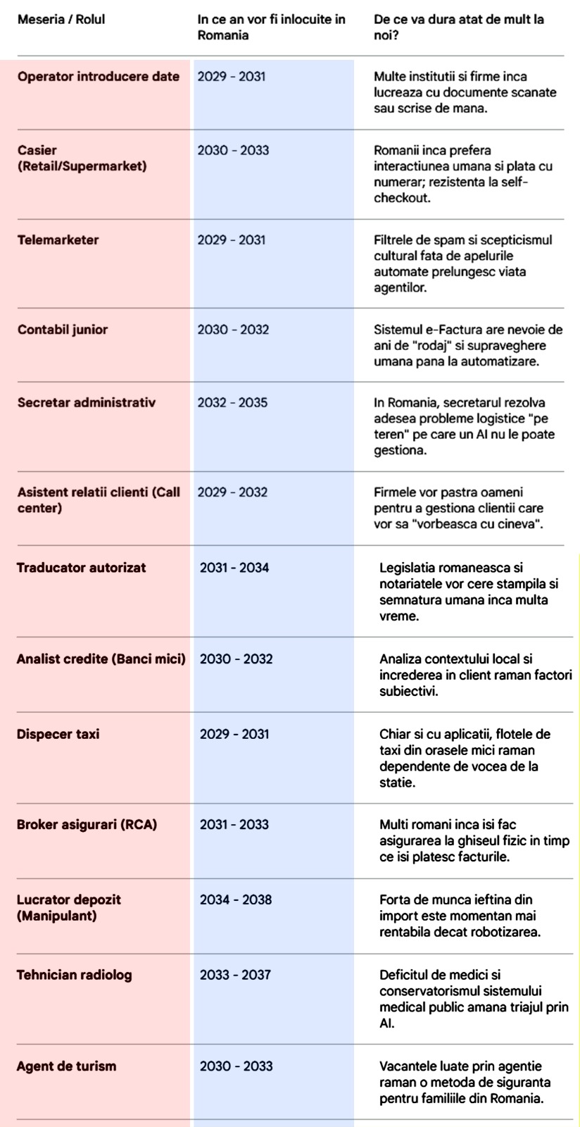 Sursa: https://www.gandul.ro/actualitate/in-ce-an-ai-putea-fi-inlocuit-de-ai-in-romania-in-functie-de-meseria-ta-tabel-pentru-25-de-job-uri-cu-grad-ridicat-de-automatizare-20839041