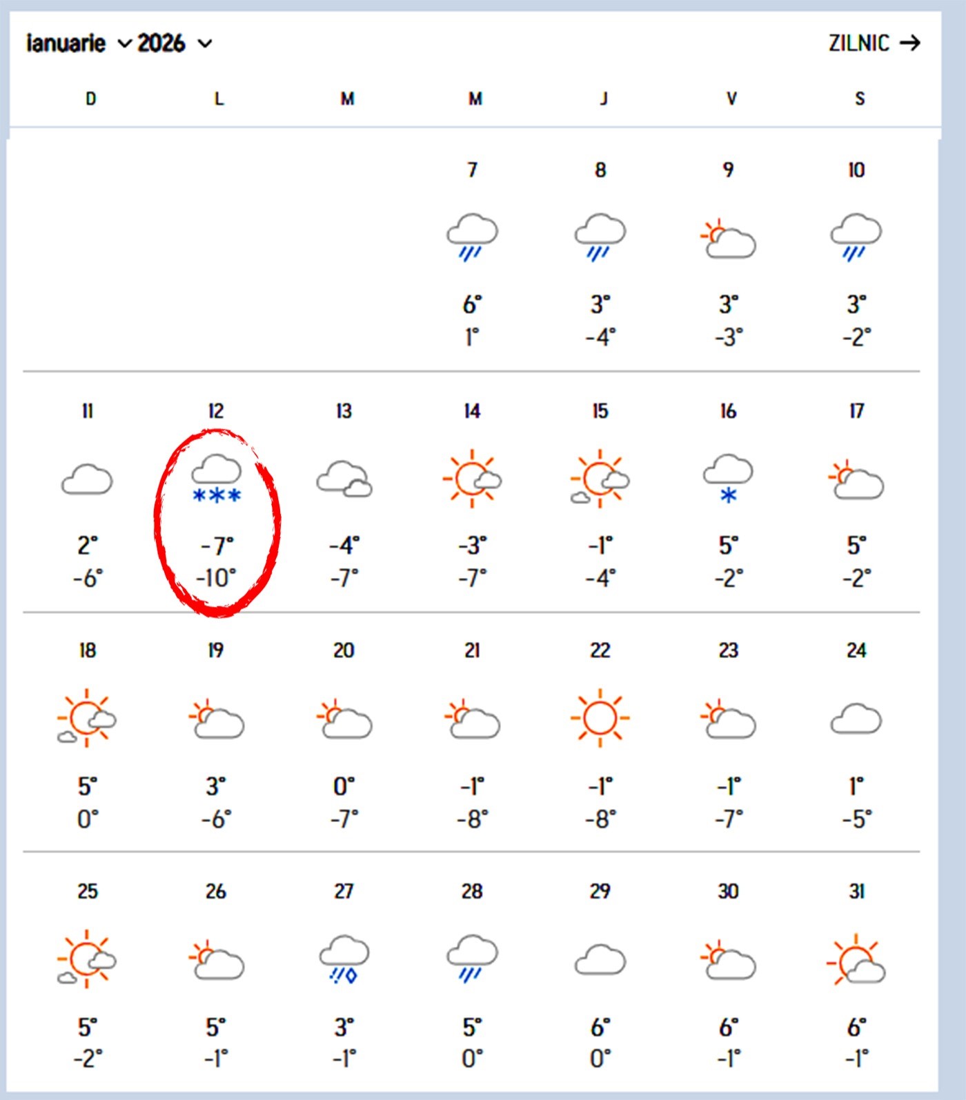 Conform datelor afișate în prognoza pentru luna ianuarie 2026, cea mai rece zi este așteptată luni, 12 ianuarie, când minima va ajunge la -10 grade Celsius, iar maxima nu va depăși -7 grade