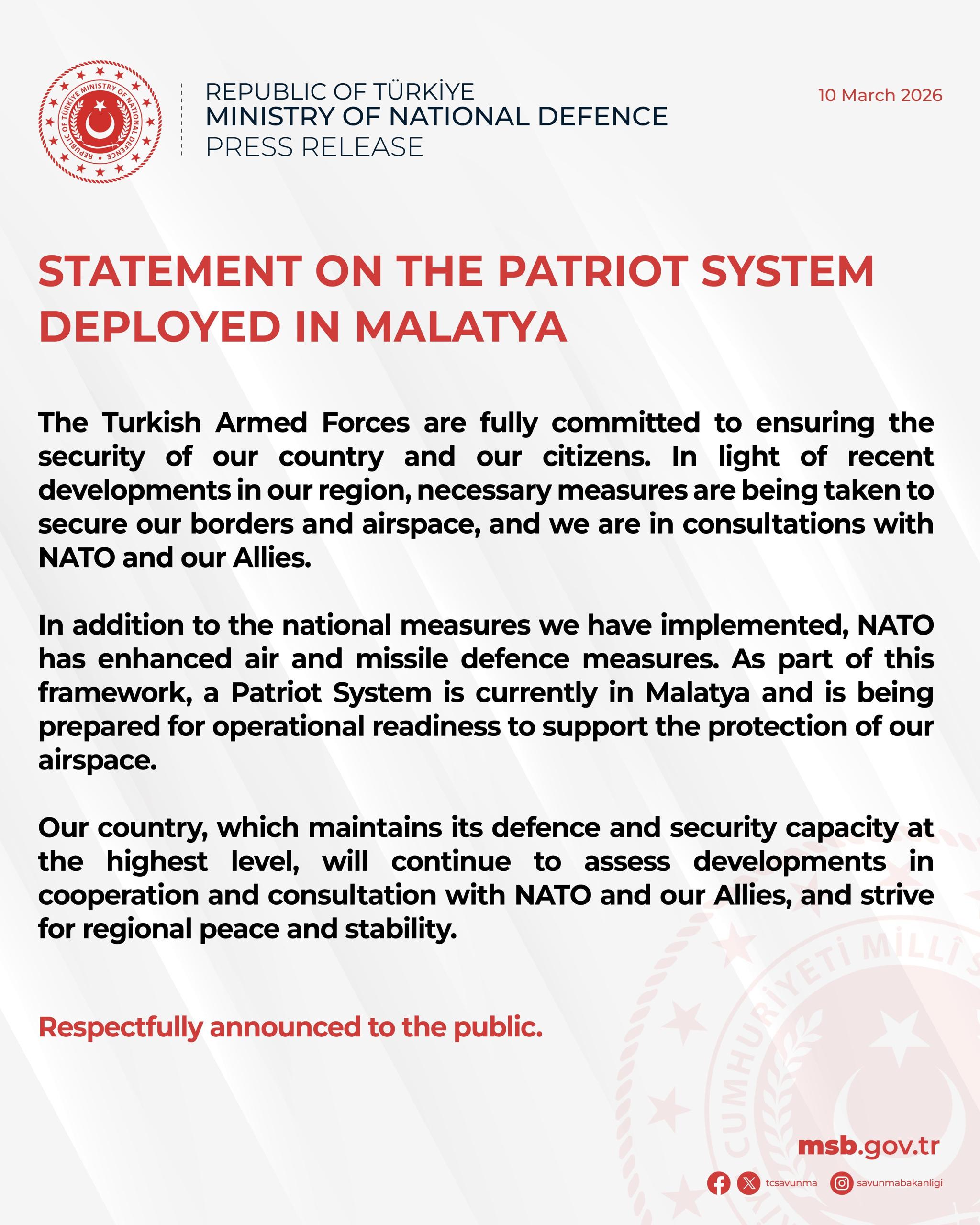 Ministerul Apărării din Turcia anunță că un sistem NATO de apărare antirachetă Patriot a fost desfășurat în Malatya, ca parte a unor măsuri sporite de apărare aeriană și antirachetă pe fondul creșterii tensiunilor regionale.