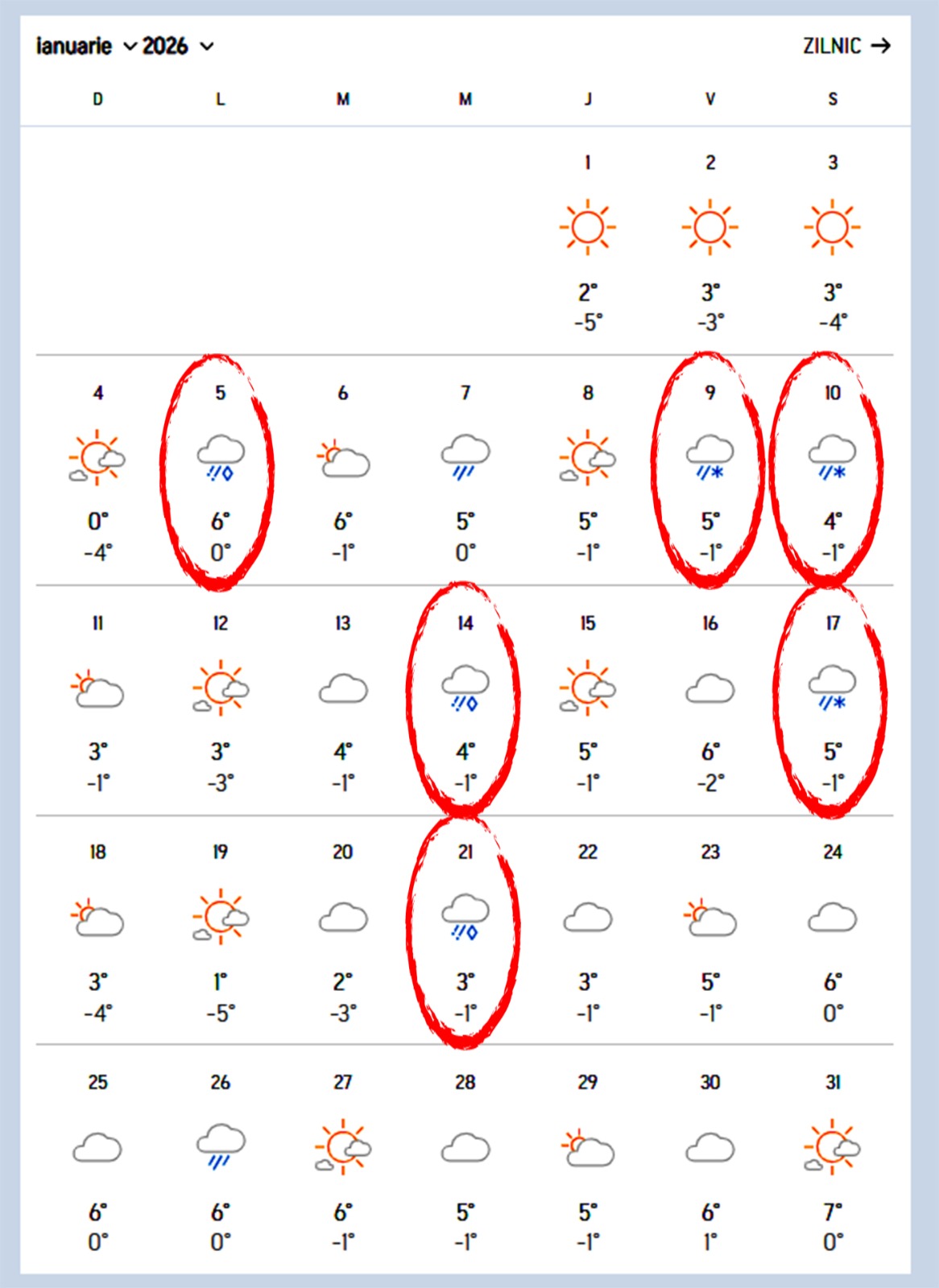 Potrivit specialiștilor Accuweather, prima lună a anului 2026 va aduce temperaturi mai scăzute decât cele normale. Prognoza pe luna ianuarie indică multe nopți geroase, unde temperaturile vor scădea sub 0 grade Celsius, cea mai friguroasă fiind noaptea de 19 ianuarie când vom înregistra -5 grade Celsius.