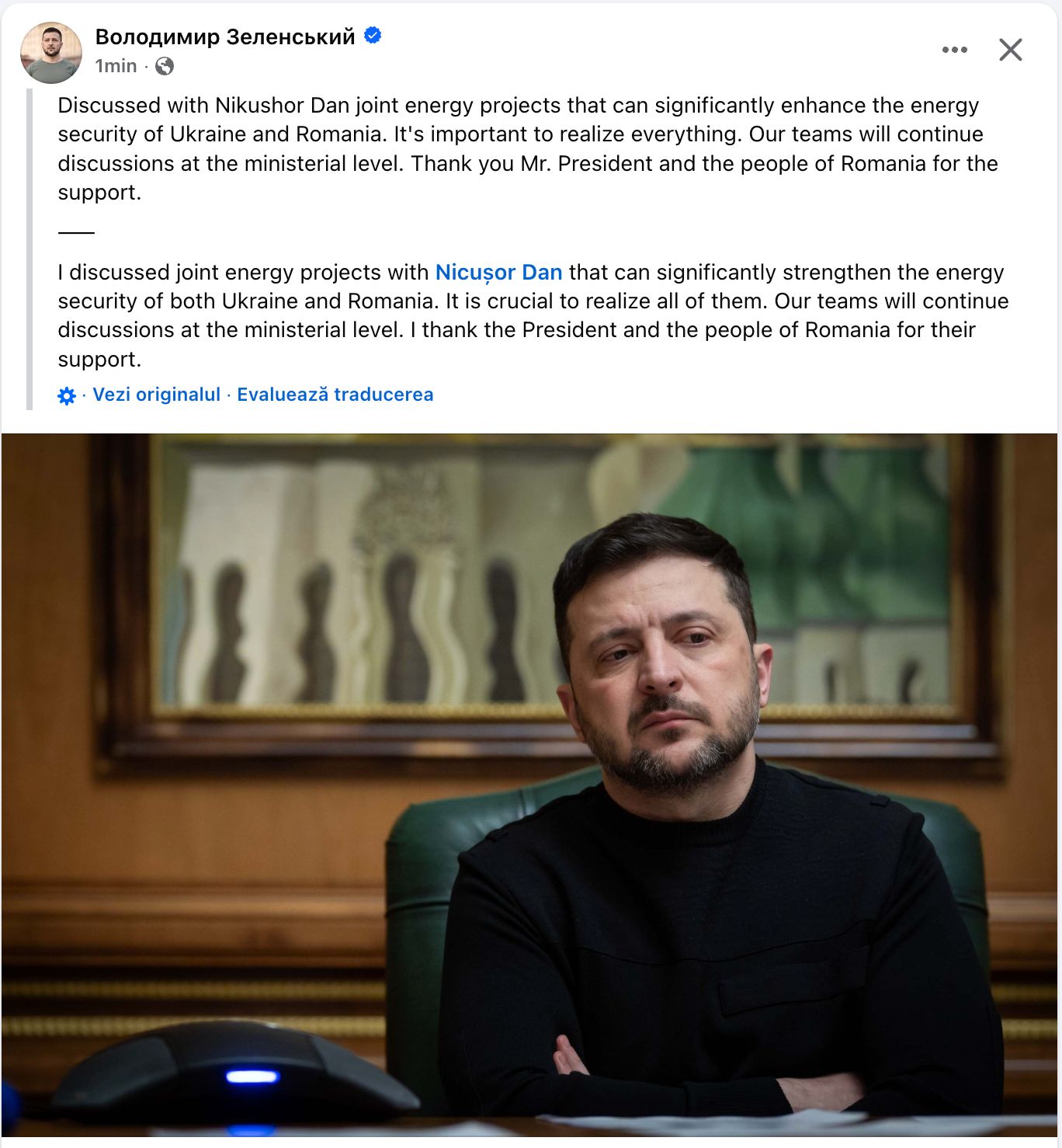 „Am discutat cu Nicușor Dan despre proiectele energetice comune, care pot întări considerabil securitatea energetică a Ucrainei și a României. Este important să implementăm totul. Echipele noastre vor continua discuțiile la nivel ministerial. Mulțumesc domnului președinte și poporului român pentru sprijin”, a transmis Volodimir Zelenski pe Facebook.