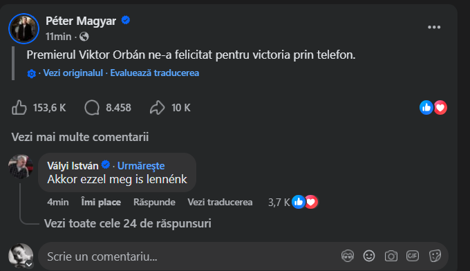 „Premierul Viktor Orbán ne-a felicitat prin telefon pentru victorie”, a transmis Magyar.