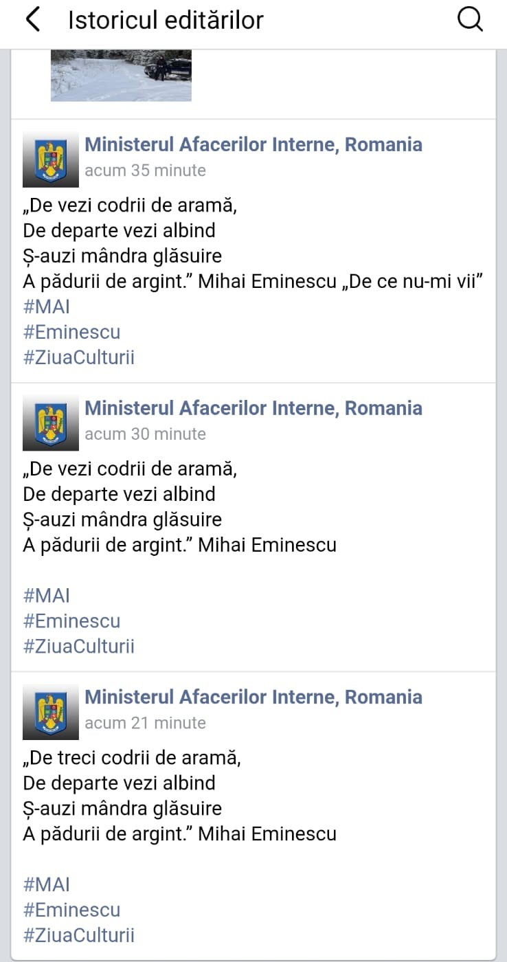 Ministerul Afacerilor Interne l-ar fi onorat mult mai bine pe poetul Mihai Eminescu, sărbătorit în fiecare an pe 15 ianuarie, dacă s-ar fi abţinut să scrie mesajul de pe pagina oficială de facebook sau măcar ar fi pus pe cineva care chiar a citit versurile acestuia. Cel care se ocupă de promovare a încurcat versurile „De treci codrii de aramă” din poemul „Călin, file din poveste „cu ale celei intitulate „De ce nu-mi vii”. Ironiile nu au întârziat să apară şi nu numai.