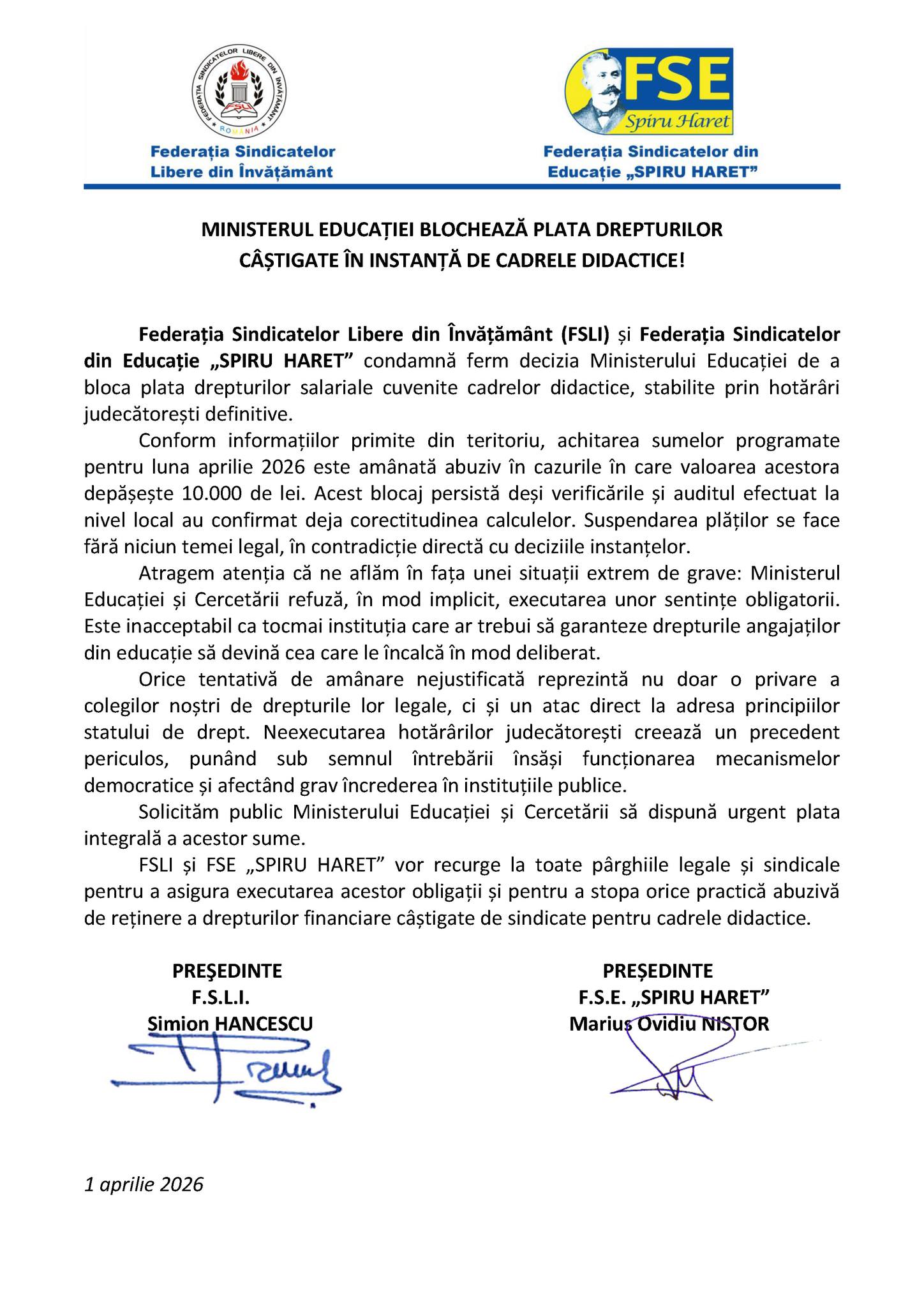 Sindicatele din Educație acuză Ministerul Educației că a oprit plata unor bani câștigați de profesori în instanță. Este vorba despre sumele care depășesc pragul de 10.000 de lei, programate pentru plata din luna aprilie 2026. Deși judecătorii au decis definitiv că acești bani aparțin cadrelor didactice, sindicatele reclamă că Ministerul amână plata fără niciun motiv legal.